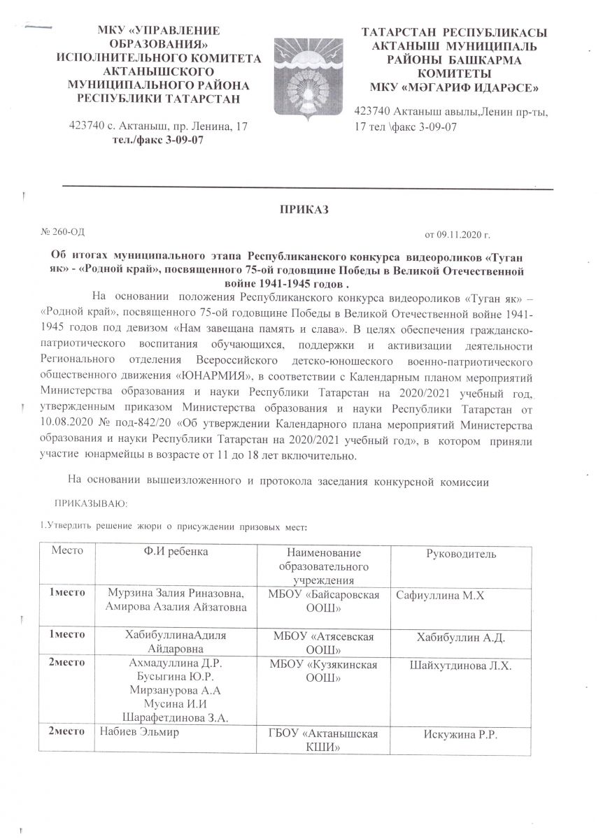 Приказ об итогах муниципального этапа Республиканского конкурса видеороликов "Родной край"