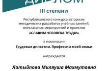 Учитель русского языка и литературы нашей школы Латыйпова М.М.награждена Дипломом III степени республиканского конкурса авторских методических разработок учебных занятий, внеклассных мероприятий и проектов "Ставим человека труда!" в номинации "Трудовые династии. Профессии моей семьи". Поздравляем!