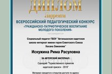 Социальный педагог нашей школы Искужина Р.Р. награждена Дипломом лауреата Всероссийского педагогического конкурса "Гражданско-патриотическое воспитание молодого поколения" за авторский материал "Сценарий торжественного принятия кадетской присяги-2019".