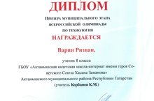 Поздравляем призёра муниципального этапа Всероссийской предметной олимпиады по технологии нашей школы ученика 8 класса Варина Ризвана и учителя технологии Корбанова К.М. Поздравляем и желаем дальнейших успехов!