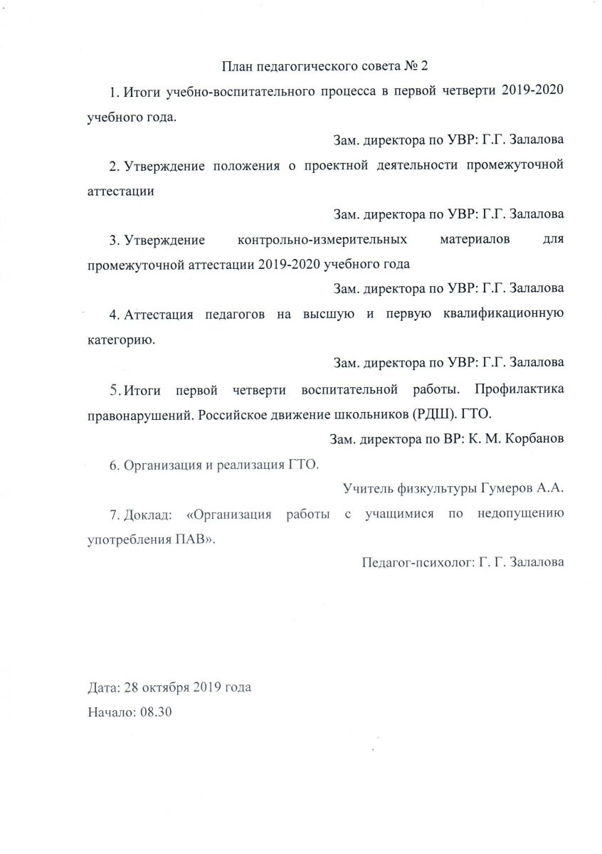 В ходе педсовета были рассмотрены и утверждены итоги учебно-воспитательного процесса в 1 четверти 2019-2020 учебного года, положения о проектной деятельности промежуточной аттестации, КИМы для промежуточной аттестации, аттестация педагогов на первую и высшую категорию и другие.