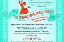 15 марта в школе прошёл международный конкурс-игра "Кенгуру". Из нашей школы приняли участие в конкурсе 19 участников и получили сертификаты, памятные призы.