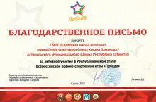 Команда ГБОУ "Актанышская кадетская школа-интернат имени Героя Советского Союза Хасана Заманова" под руководством заместителя директора по ВР Мингазова Р.Л. в составе 10 кадетов заняла общекомандное IV место и награждена благодарственным письмом.
