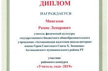 Дипломами участника районного конкурса "Учитель года - 2019" награждены следующие наши учителя: Мингазов Р.Л., Гардиева Л.Ф. и Мисбахова Р.Р. Поздравляем!