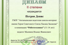 Ученик 6 класса нашей школы Петров Денис(учитель Маликов И.Ф.) награждён Дипломом II степени VI республиканского конкурса экологической социальной рекламы "Город под защитой детства" в номинации "Робототехника". Поздравляем и желаем дальнейших успехов!
