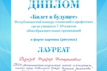 Ученик 7 класса нашей школы Газизов Фирзар(руководитель Курбанова А.Ф.) стал лауреатом республиканского конкурса сочинений о профессиях среди учащихся 7-11 классов общеобразовательных организаций "Билет в будущее" и награждён Дипломом. Поздравляем и желаем дальнейших успехов!