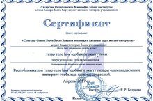 Учитель татарского языка и литературы Фархутдинова Л.Ф. приняла участие в Международной олимпиаде учителей татарского языка и литературы и получила сертификат участника.