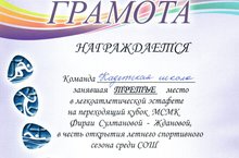 5 мая в с.Актаныш прошли районные соревнования по легкоатлетической эстафете на переходящий Кубок МСМК Фираи Султановой Ждановой. На соревнованиях приняли участие 19 команд из разных школ Актанышского района. Старшая команда кадетской школы-интернат под руководством учителя физкультуры Мингазова Р.Л. и инструктора по физ.подготовке Ахмарова Л.Р. заняла III место. Поздравляем!