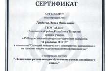 Учитель английского языка Гардиева Л.Ф. приняла участие в Всероссийском конкурсе методических разработок "Я реализую ФГОС" в номинации "Сценарий методического мероприятия, направленного на освоение нового педагогического профессионализма" с материалом на тему "Технология развивающего обучения на уроках английского языка" и получила сертификат участника.