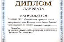 Учащиеся 5-6 классов нашей школы: Петров Д., Шайдуллина Э., Хафизов А., Миннуллина А., Николаев С., Алчинов Р., Габдрахманова Р. и Мухаметов И. стали лауреатами и награждены Дипломами. Руководители Маликов И.Ф. и Мисбахова Р.Р. Поздравляем и желаем дальнейших успехов!