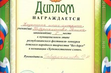 Ученица 9а класса нашей школы Габдрахманова Регина(руководитель Габдрахманова Р.М.) заняла I место в муниципальном этапе республиканского фестиваля-конкурса детского народного творчества "Без бергә" в номинации "Художественное слово" и награждена Дипломом. Поздравляем!