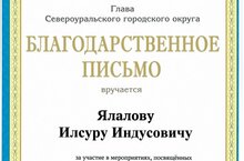 Ялалову Илсуру Индусовичу вручен благодарственное письмо за участие в мероприятиях, посвящённых 110-летию Героя Советского Союза Хасана Замановав Североуральском городском округе, Свердловской области.