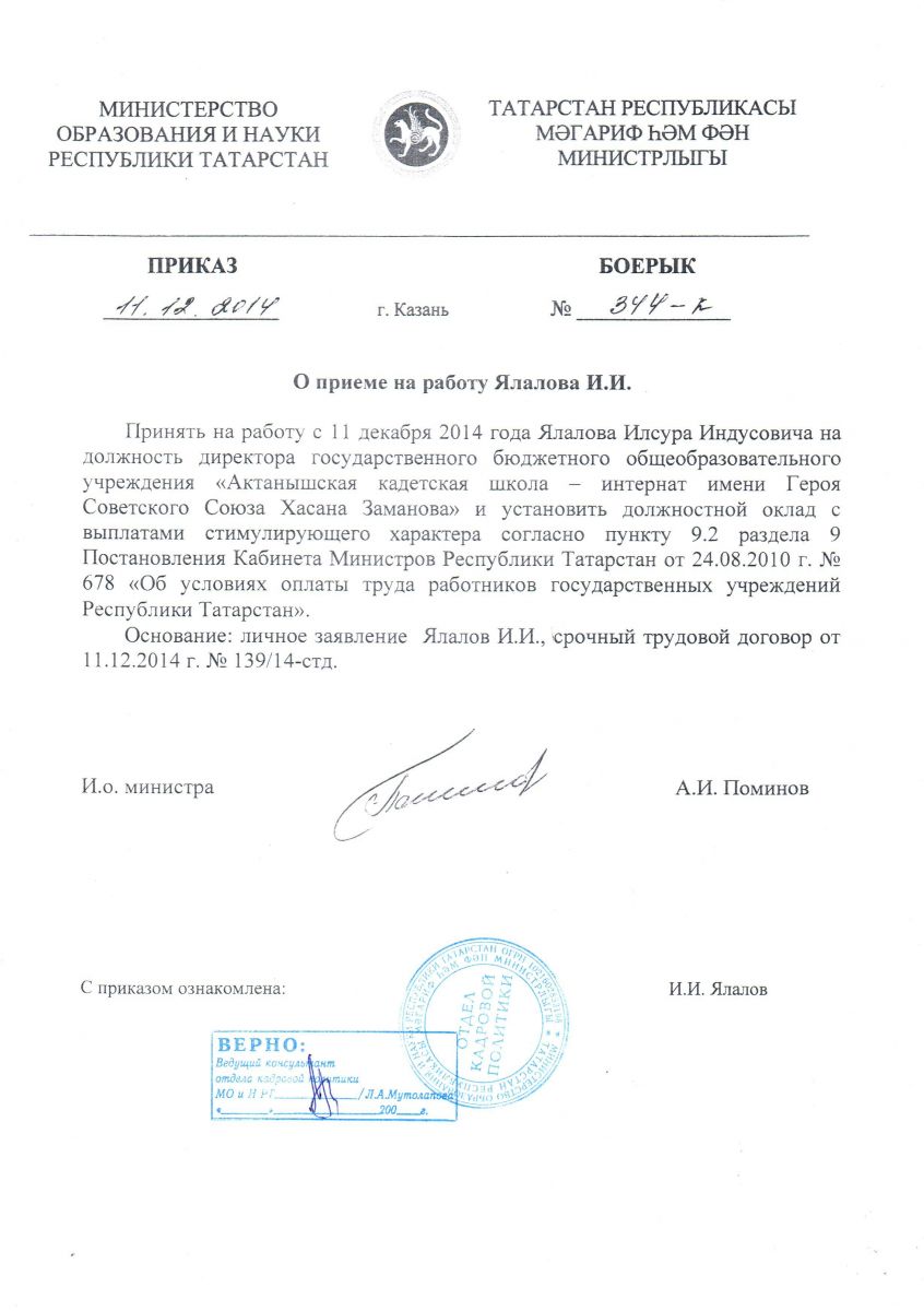 Приказ о приеме на работу Ялалова И.И