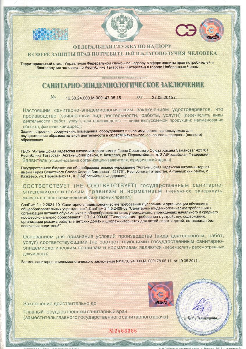 Санитарно- эпидемиологическое заключение, 27.05.2015