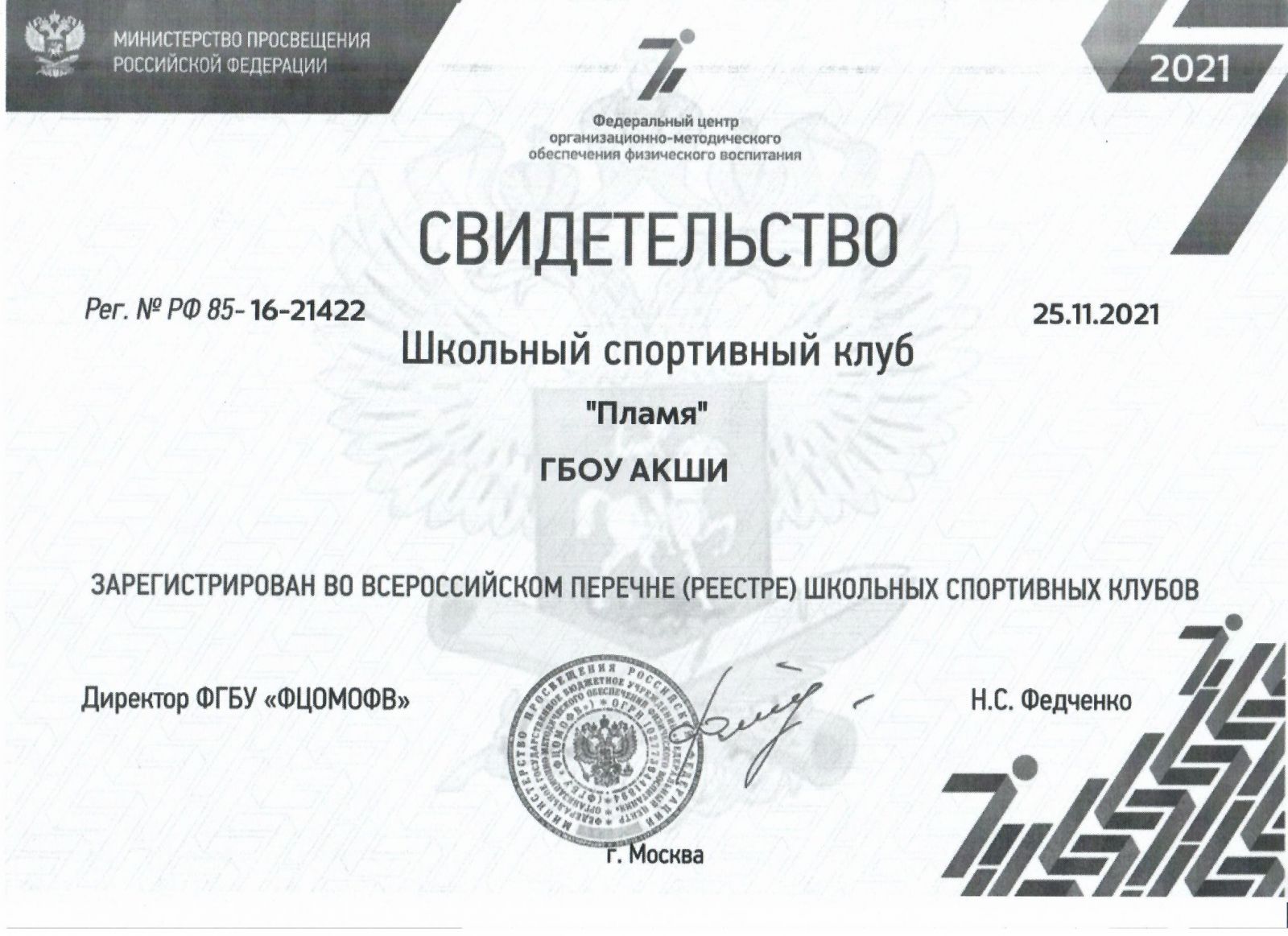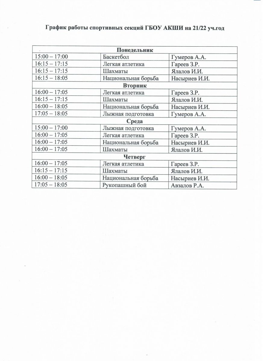 График работы спортивных секций ГБОУ АКШИ на 2021-2022 учебный год