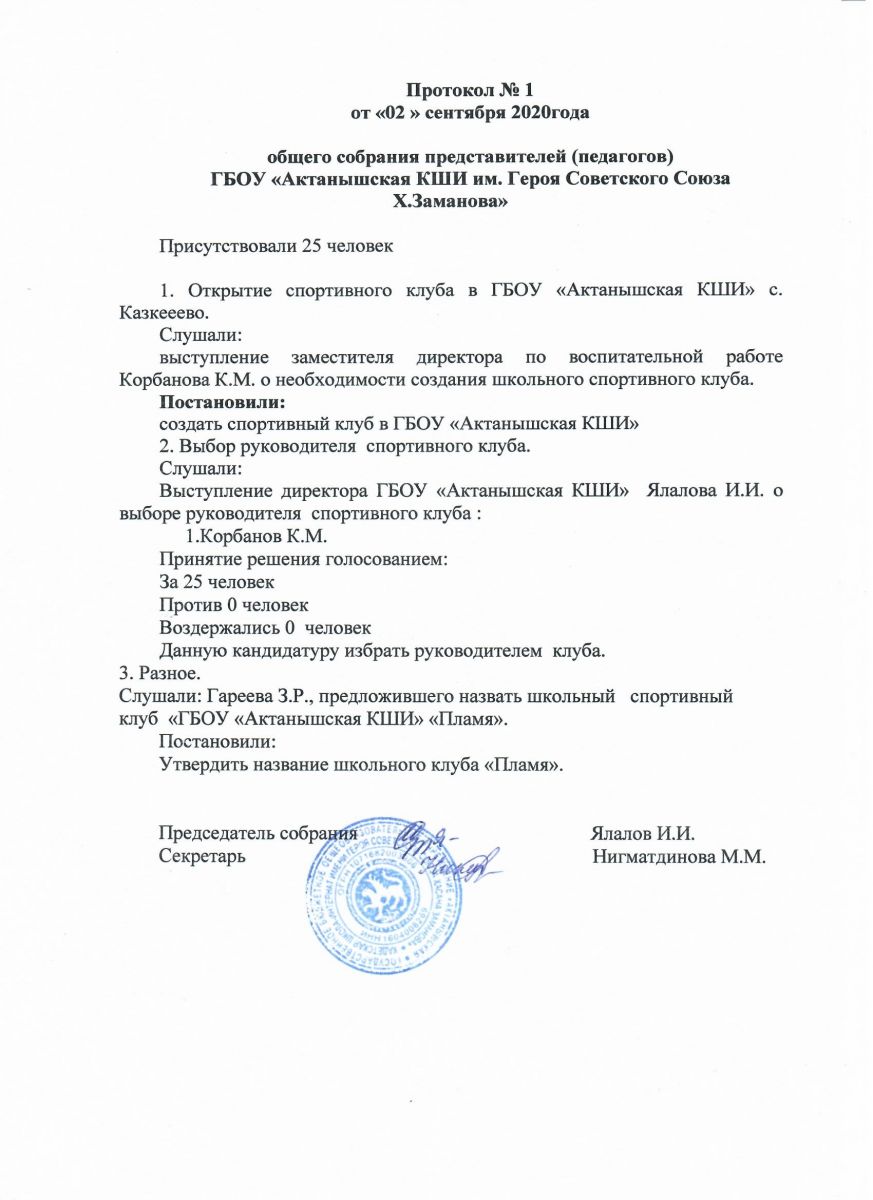 Протокол № 1 от «02 » сентября 2020 года общего собрания представителей (педагогов)