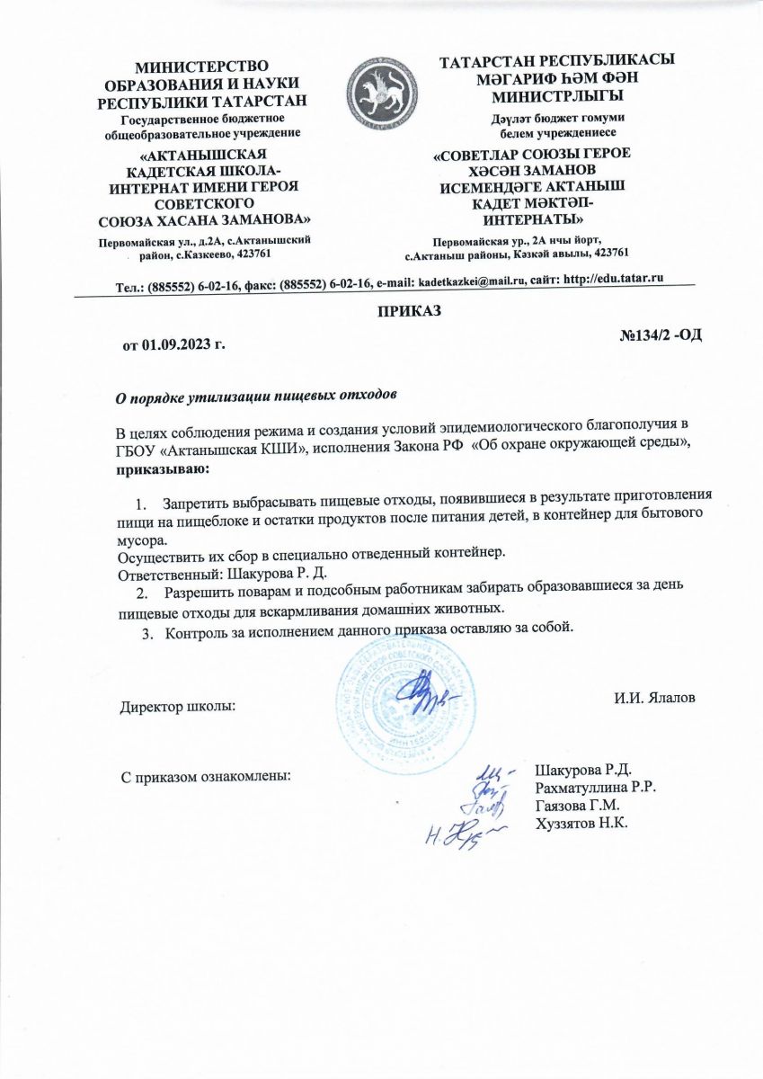 Приказ № 134/2 от 01.09.2023 О порядке утилизации пищевых отходов