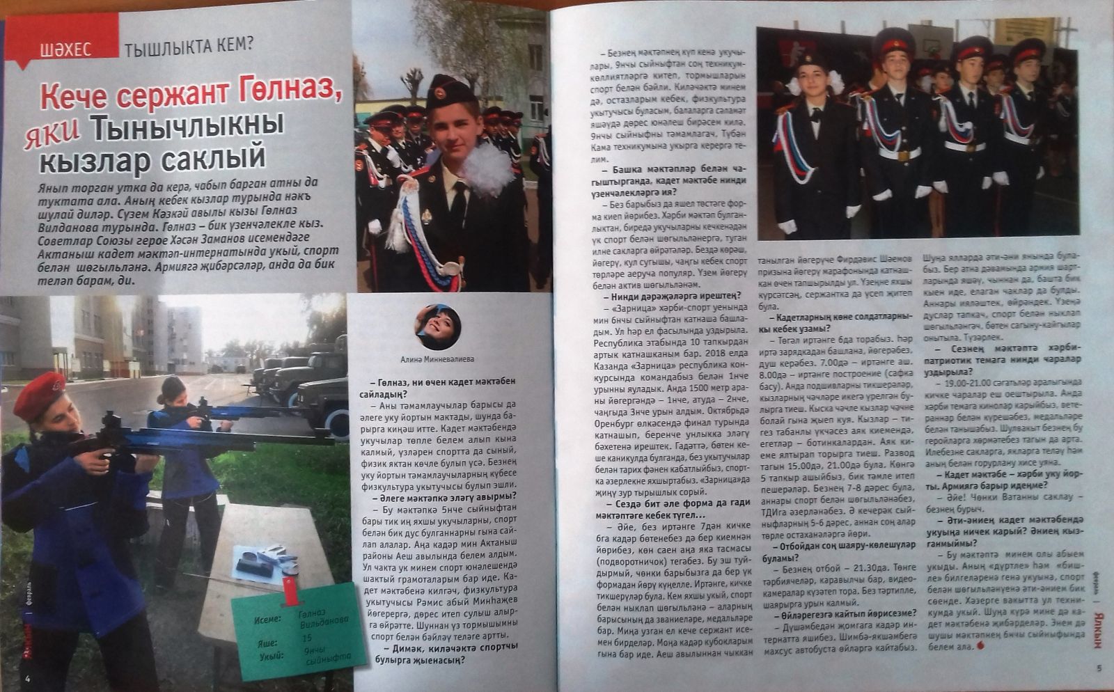 Опубликовано: 19.02.2019Опубликована статья "Армияга барыр идем!" ученицы 9а класса нашей школы Вильдановой Г. в республиканском журнале "Ялкын" , №2(01.02.2019)