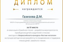 Негосударственное образовательное учреждение ДПО "Центр социально-гуманитарного образования" провел Всероссийский конкурс "Растим читателя" на лучшую методическую разработку по продвижению и подготовке чтения детей, семейного чтения. Учитель начальных классов Газизова Д.М. участвовала в этом проекте и заняла 3 место в номинации "Семейное чтение - разработка мероприятия по приобщению детей и родителей к чтению". Поздравляем!!!