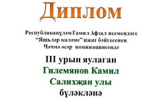 Ученик 4 класса Гилемьянов Камиль награжден дипломом 3-й степени республиканского творческого конкурса "Яшьләр каләме" им. Гамиля Афзала в номинации "Проза". Руководитель Газизова Д.М.