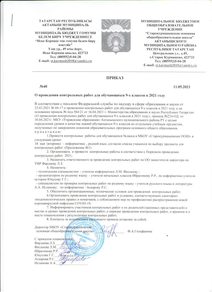 - Приказ о проведении контрольных работ для обучающихся 9 классов в 2021 году