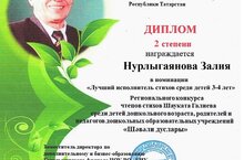 Бакчабызның икенче кечкенәләр төркеменә йөрүче Нурлыгаянова Зәлия "Шәвәли дуслары" дип аталган региональ конкурсның "Лучший исполнитель стихов среди детей 3-4 лет" номинациясендә 2 урынга ия булды. Афәрин, котлыйбыз!