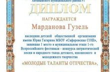 “ Ватанның яшь талантлары” Бөтенрәсәй фестиваль- конкурсының муниципаль этабында вокал-соло номинациясендә Марданова Г- 1 урын, Зиннурова Л- 2 урын, вокал-дуэт номинациясендә Нурлыгаянов И. һәм Хайбуллин И. - 2 урыннарны яуладылар.