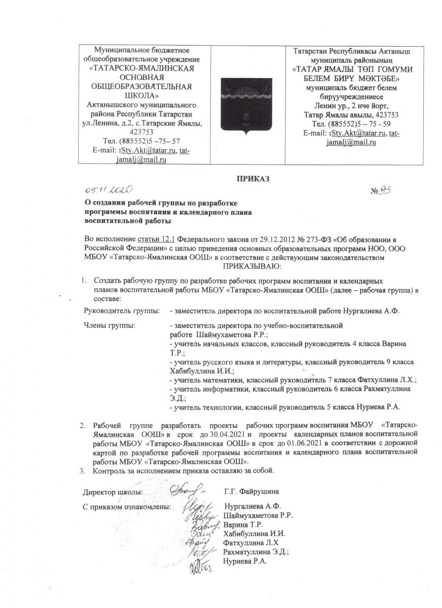 Приказ "О создании рабочей группы по разработке программы воспитания и календарного плана воспитательной работы" 2021-2022 уч год