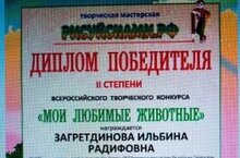 Учащиеся нашей школы приняли участие во Всероссийском творческом конкурсе "Мои любимые животные". Загретдинова Ильбина заняла II место, Марданов Аяз III место.Руководитель Билалова С.С. Поздравляем!!!