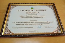 Наша школа награждена Благодарственным письмом за вклад в профилактику правонарушений среди учащихся образовательных учреждений. Поздравляем коллектив школы!