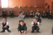 Укучылар комитетының "спорт министры" балалар белән гимнастика үткәрә.