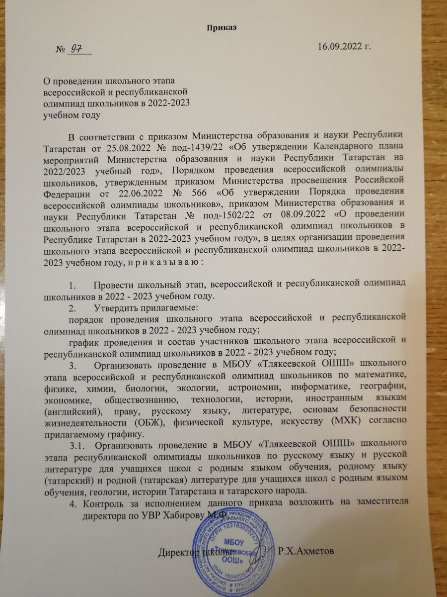 МБОУ Тлякеевская ООШ приказ о проведении школьного этапа олимпиады 2021-2022 учебный год.doc