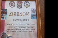 Команда нашей школы в составе :Галимуллин Динар и Гарипов Алгиз (учитель Исламов И.Р.)заняла 2 место на XIII районных соревнованиях по биатлону среди юношей,посвященных ко "Дню защитника отечества".Поздравляем вас!!!
