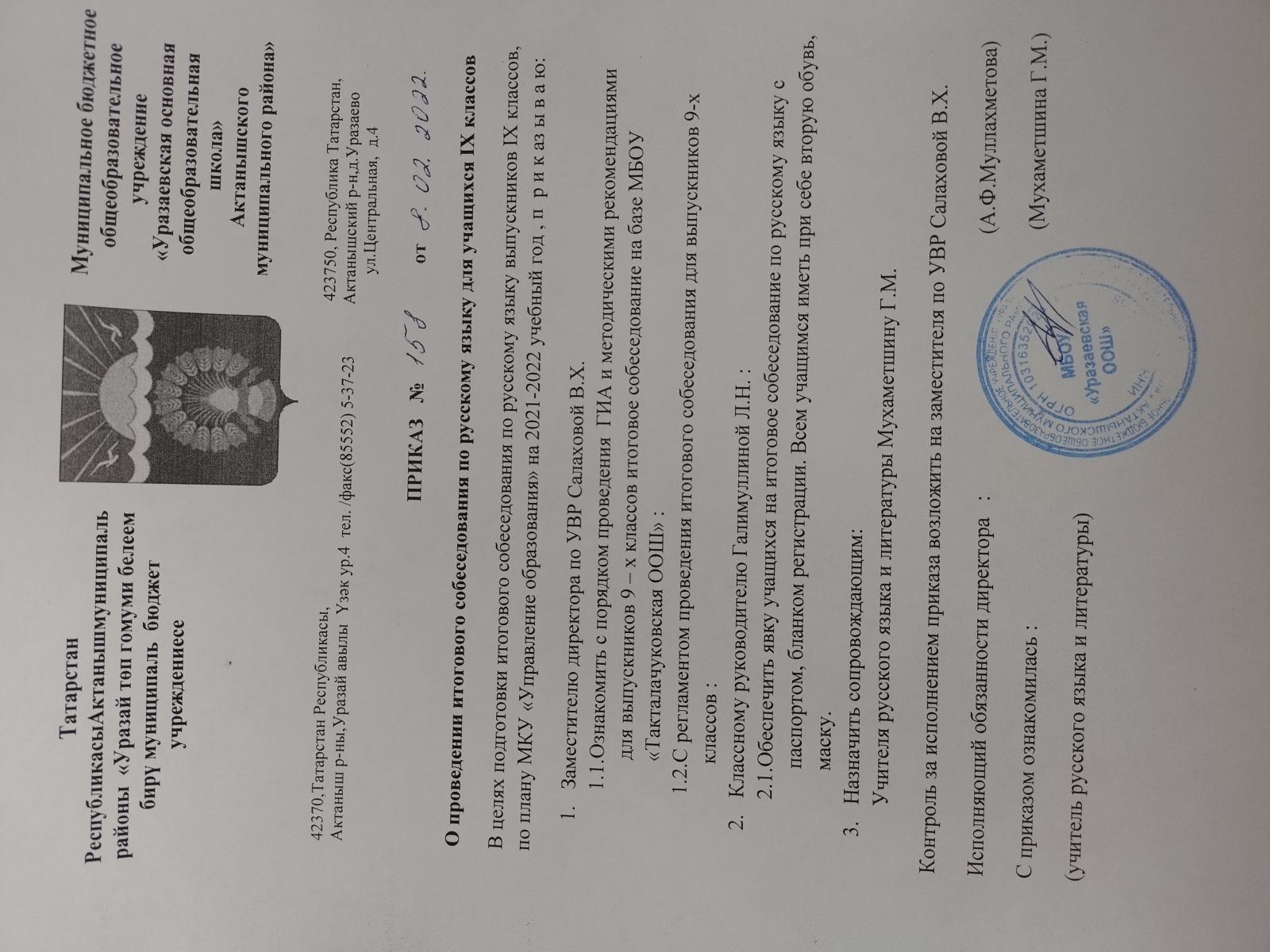 Муниципальное бюджетное общеобразовательное учреждение «Уразаевская основная общеобразовательная школа» Актанышского района РТ/ Татарстан Республикасы Актаныш муниципаль районы "Уразай төп гомуми белем бирү мәктәбе» муниципаль бюджет гомуми белем бирү учреждениесе