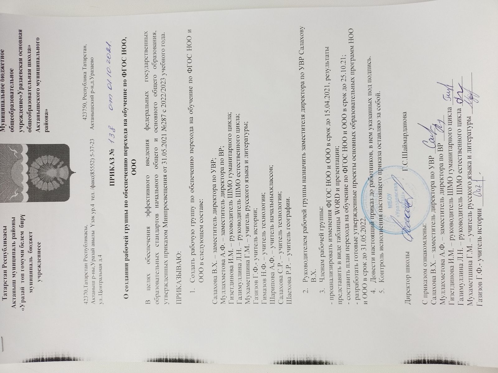 Приказ о создании рабочей группы по переходу на обучение по ФГОС НОО и ООО