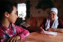 6 класс укучысы Рахматуллина Алинә , лаеклы ялдагы укытучы Петрова Нина апа белән очрашып сөйләште һәм мәктәп тарихы турында проект эше башкарды.