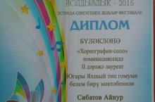 1 сыйныф укучысы Сибатов Айнур "Йолдызлык-2016"да гала-концертта "Хореография-соло" номинациясендә II дәрәҗә лауреат дипломы белән бүләкләнде. Котлыйбыз!