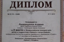 6 сыйныф укучысы Рахматуллин Азамат I Бөтенрәсәй "Акыллы һәм талантлы" исемле конкурсында "Әдәби сәнгать" номинациясендә "Телефон" шигыре белән икенче урын яулады. Укытучысы Зигангирова З.А.