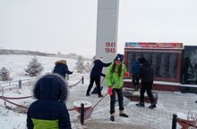 Сегодня наши ученики побывали на субботнике у памятника. Памятник очистили от снега.