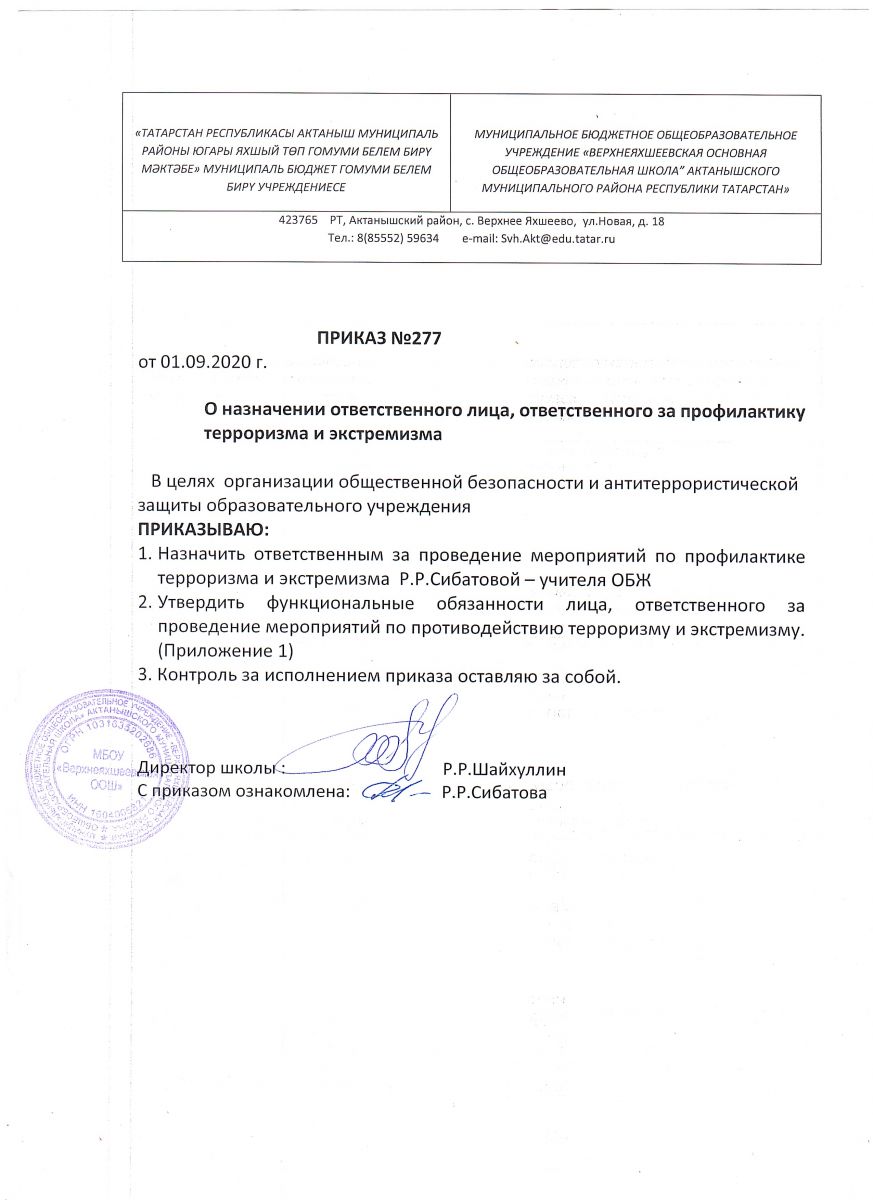 Приказ о назначение ответственного лица за профилактику террозизма и экстремизма