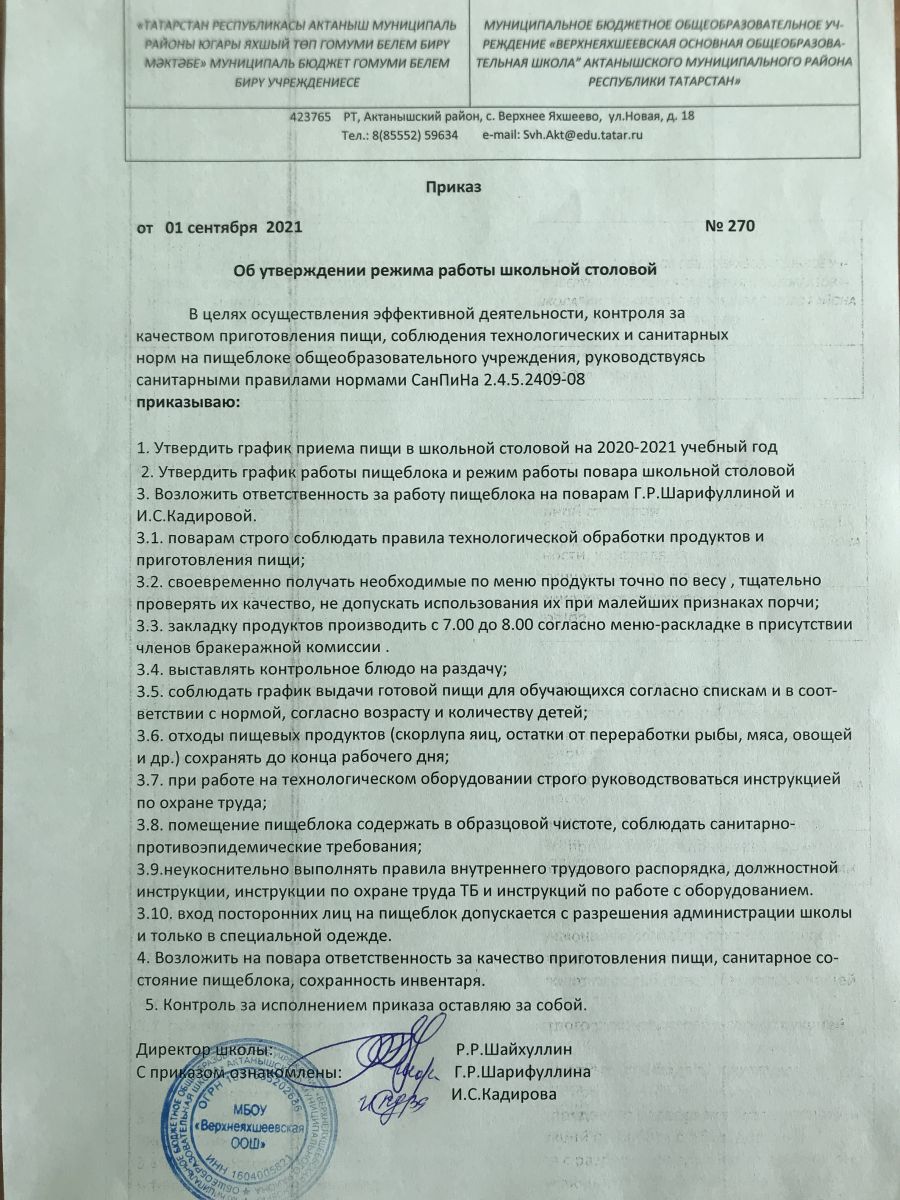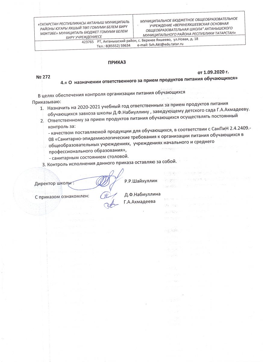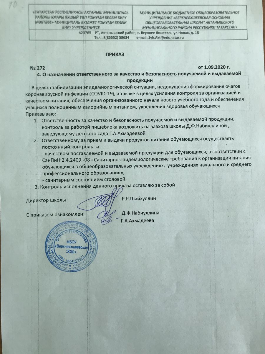 Приказ о назначении ответственного за прием продуктов питания обучающихся