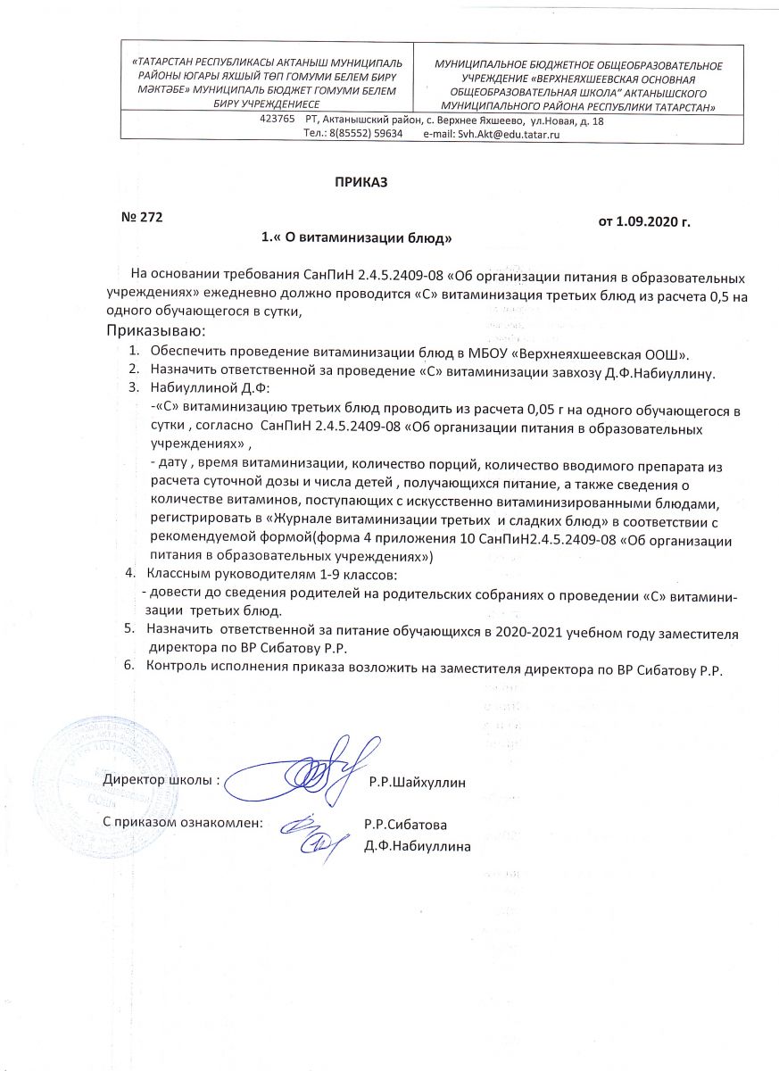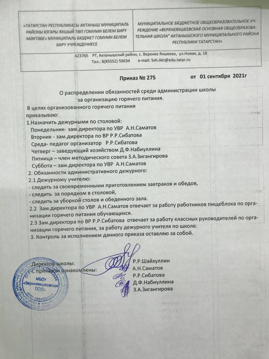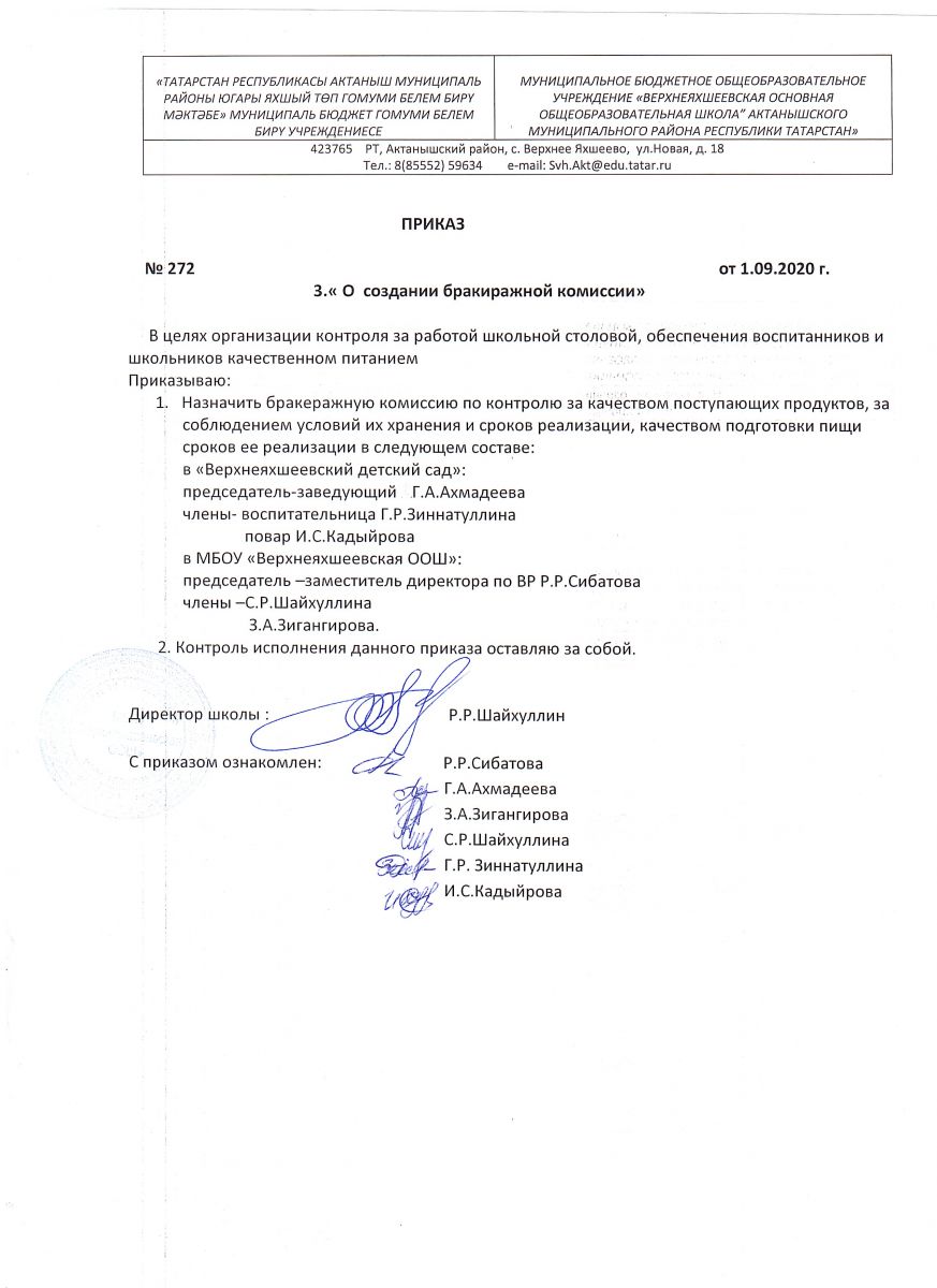 Приказ о назначении ответственного за прием продуктов питания обучающихся