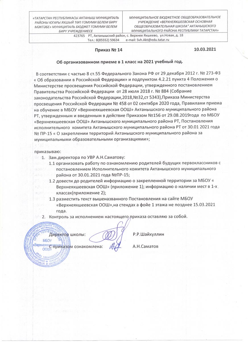 Приказ школы об организованном приеме в 1 класс на 2021-2022 учебный год