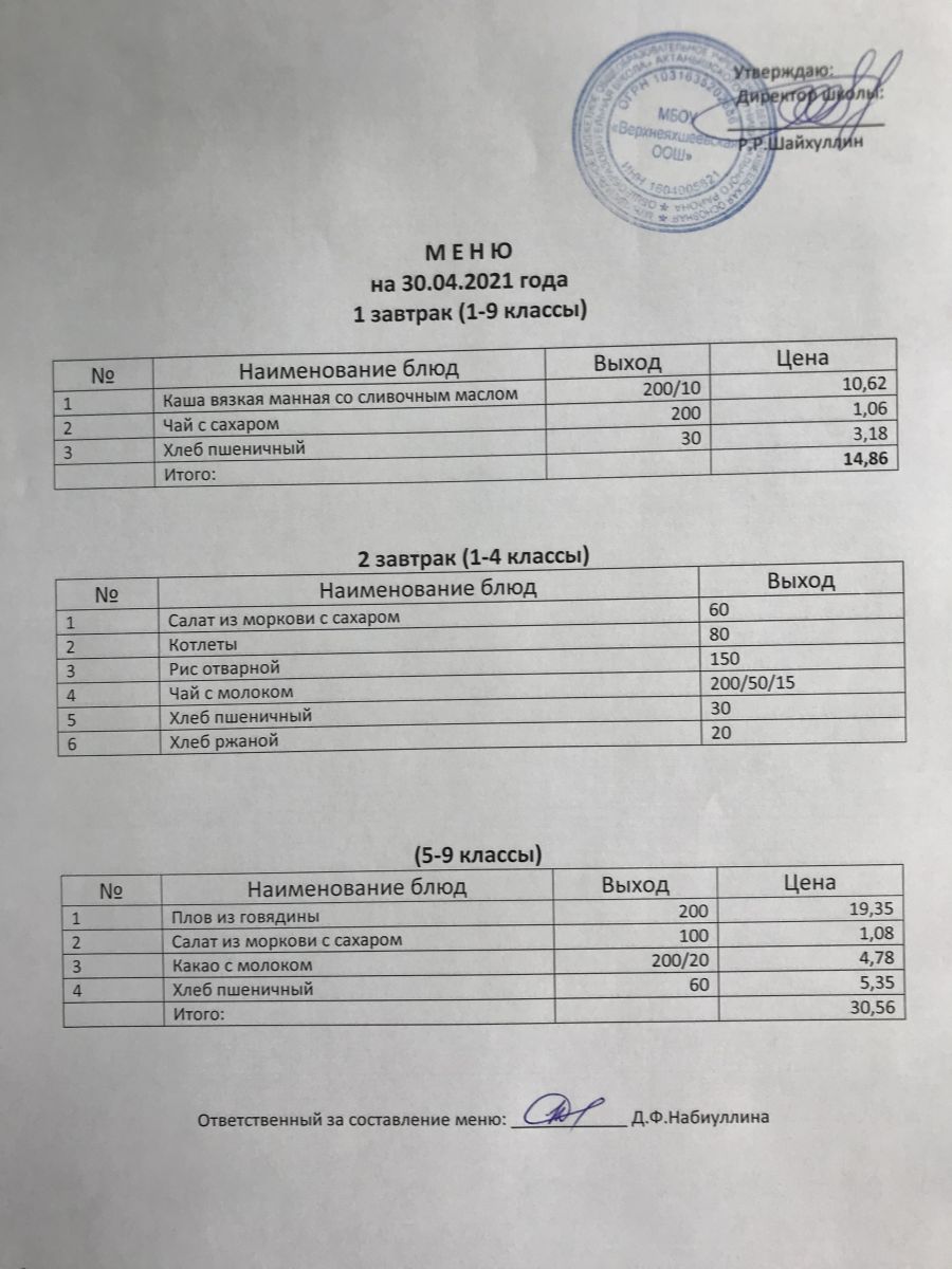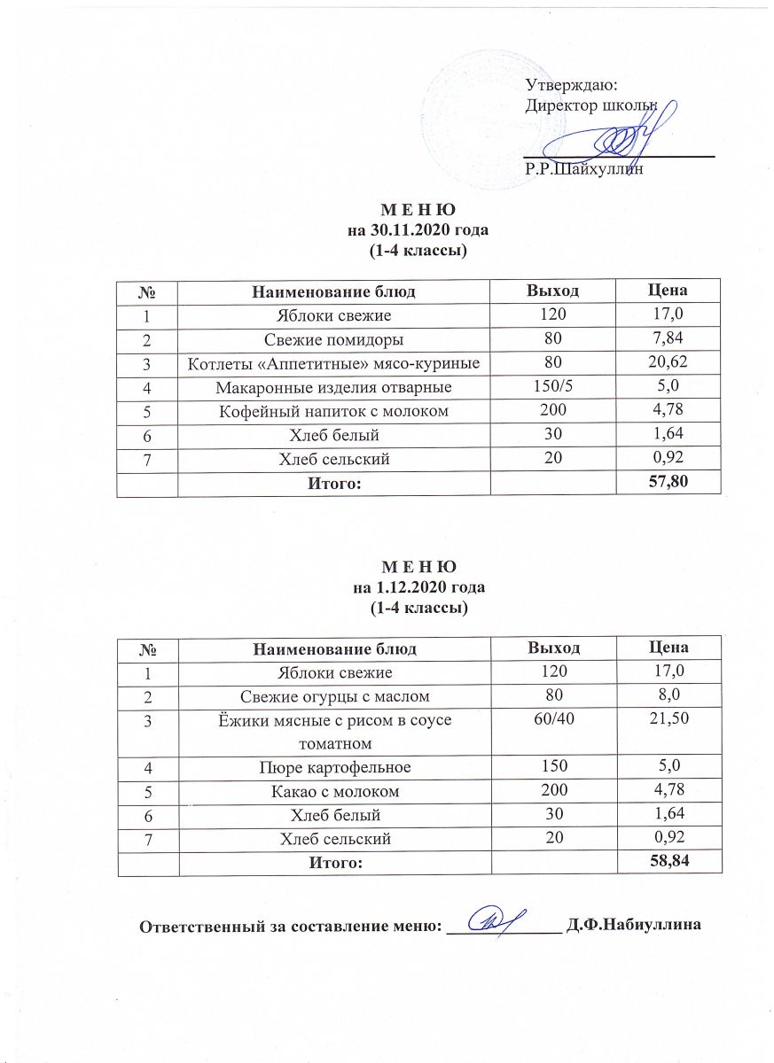 Меню на 30.11.2020 и 01.12.2020