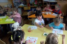 Художественно-эстетическое развитие ( Рисование) во второй младшей группе на тему: "Разноцветный ковёр из листьев". Дети учились идентифицировать жёлтый, зелёный, красный цвета, рисовать листья способом примакивания. Развивали умение рисовать кистью.