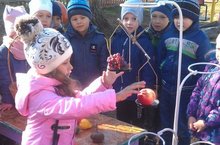 Дети подготовительной группы с воспитателем Янонис М.А. во время прогулки занимаются исследовательской деятельностью, играют в игру "Тяжелый-легкий". Взвешивая на весах овощи и фрукты, дети определяют, что тяжелее, а что легче и самостоятельно делают вывод.
