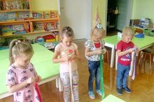 Дети старшей группы с воспитателем Черновой Н.Н. провели ".День бантика": раскрашивали будущий бант из бумаги, соревновались в свертывании ленты.
