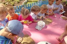 Дети старшей группы исследовали свойства песка. Рассматривали его через лупу и узнали состояние песка в сухом и мокром виде.