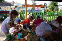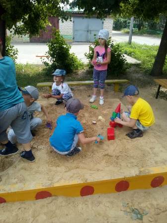 Дети старшей группы лепят куличи и делают постройки из песка.