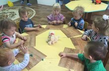 Дети 2 группы раннего возраста с воспитателем лепили мисочку для собачки Жучки,